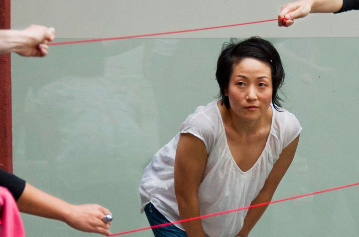 Les spectateurs entrent et se débarrassent de leurs sacs, vestes etc. au vestiaire. Ils pénètrent dans la salle où YoungSoon Cho Jaquet les attends. Dans sa main, elle tient les cordelettes, certaines courtes, d’autres longues. Ils s’attachent une extrémité de la corde au poignet et l’autre au poignet d’une autre personne jusqu’à ce que tout le monde soit lié à tout le monde. La chorégraphe iinitie les déplacements et le public. Rapidement se dessine une danse d’ensemble. Les fils se croisent et s’emmêlent créant des formes inédites.